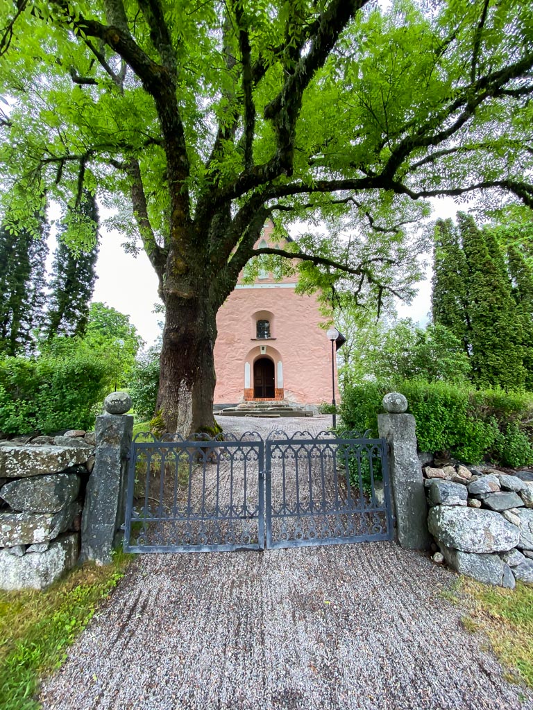 Huvud från medeltida skulptur inmurad på utsidan ovan kyrkans portal. Skulpturen syns också på bilden av kyrkobyggnaden ovan. Gustaf och jag diskuterade vem huvudet skulle kunna förställa. Sonen menade att huvudet liknade skulpturen av Erik den Helige i Gamla Uppsala domkyrka varför det sannolikt är Sankt Erik som huvudet föreställer. Efter mycket sökande i litteraturen hittade jag på RAÄ uppgifter om skulpturen. Där anges att det är Sankt Erik alternativt Sankt Olof. De är enligt RAÄ sannolikt sedan gammalt kyrkans speciella skyddshelgon. Vi stannar med angiven bakgrund för uppfattningen att detta kan vara ett huvud (del av medeltida skulptur) av Erik den Helige. Den har inmurats som exteriör utsmyckning någon gång under åren 1470–1499.