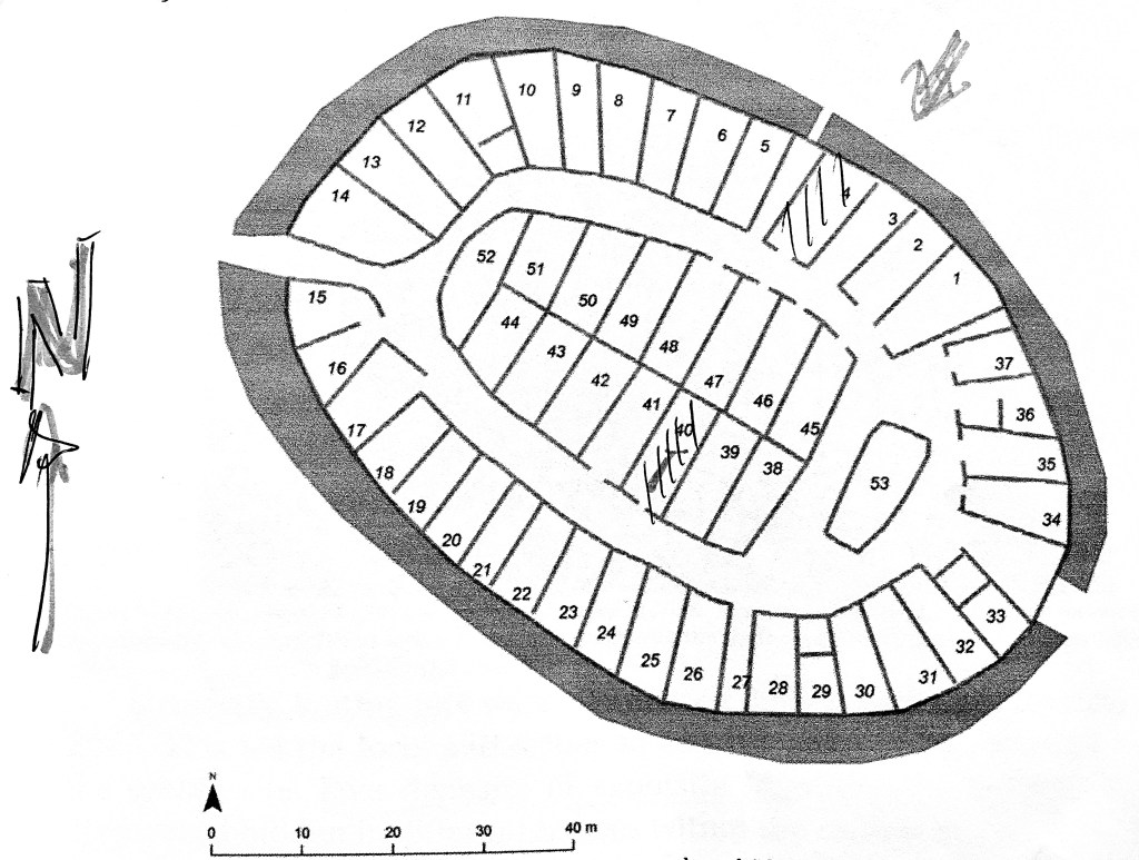 Muren har varit cirka fyra meter tjock, och är högst i nordväst och lägst i sydost. Den har haft 53 hus.