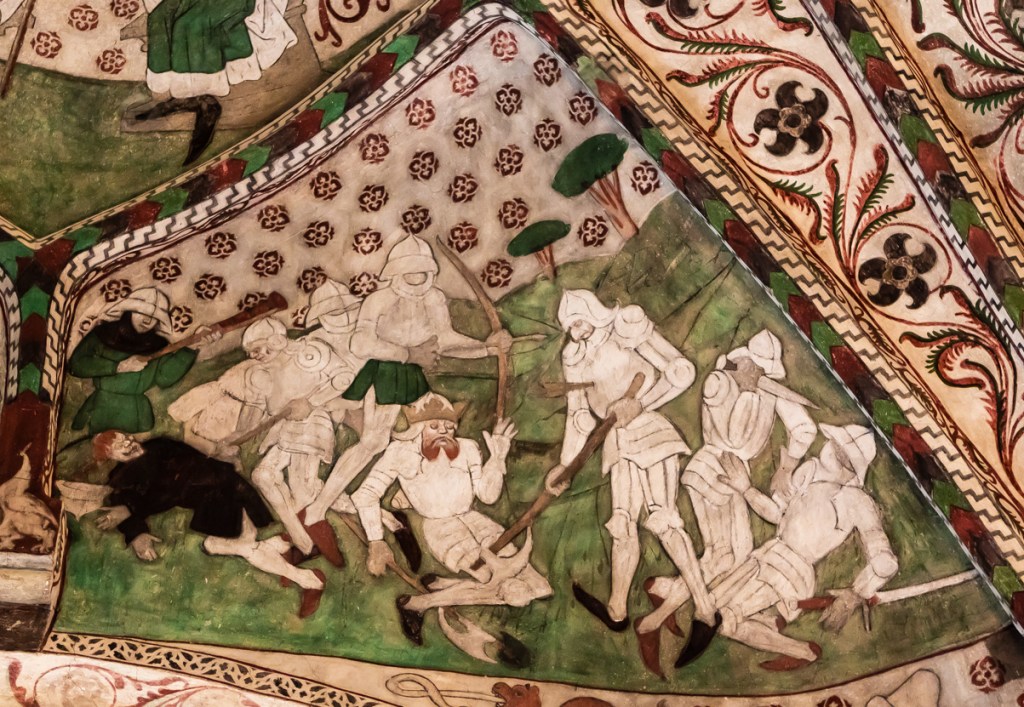 En mycket intressant och dramatisk stridsscen. Den visar hur riddare var beväpnade offensivt och defensivt under det slutande 1400-talet. En av riddarna (Olof den helige i detta konkreta fall) blir huggen i den relativt svagt skyddad knäleden med en stridsyxa och försätts därmed ur stridbart skick. Riddaren som hugger med stridsyxan har träffats av en pil från en idegransbåde som med spetsen penetrerat rustningen och sannolikt också försatt denne riddare ur stridbart skick efter en stunds blödande. En tredje riddare har fallit och får nådastöten genom en oskyddad del av rustningen av en stridsdolk av kraftigare typ. En bonde beväpnad med den för bondearmér vanliga klubban försöker i bildens vänsterkant att utdela ett avgörande klubbslag mot hjälmen på en femte riddare med rustning som samtidigt utdelar en dödande stöt av vad som förefaller vara ett spjut på en en liggande bonde. I bakgrunden den riddare som skjutit pilen. Ännu en riddare skymtar där bakom. En dramatisk och realistisk stridsscen från 1400-talet. Så här såg en strid man mot man ut. Ett hugg mot benen var dödande och försatte motståndaren omedelbart ur stridbart skick. Detta kan man se på skeletten efter dem som stupade utanför Visby murar på den s.k. Korsbetningen när Valdemar Atterdag år 1361 intog som prisgavs utan strid av borgarna och handelsmännen i Visby medan bondearmén som försvarade staden stupade till sista man utanför murarna som inte öppnades av borgarna i staden.