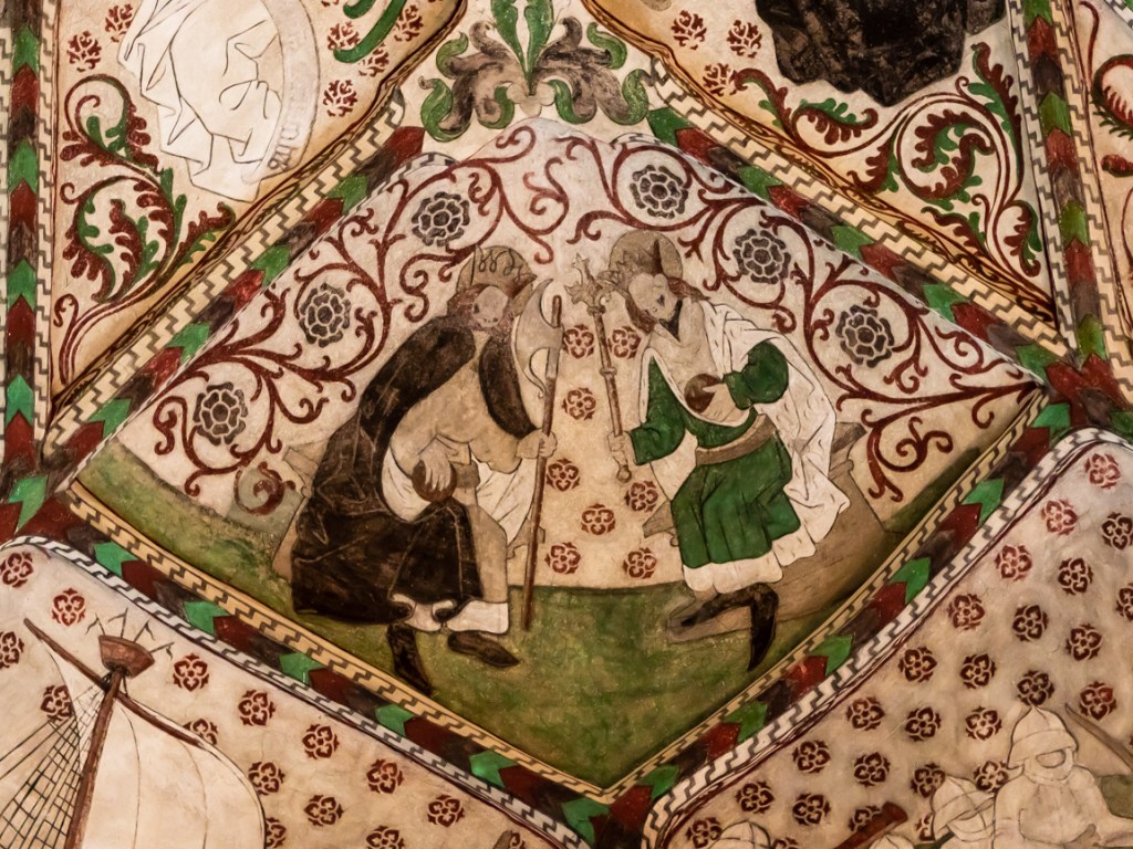 Det typiska för Albertus Pictor är att ha inte lämnar någon enda del av väggar och ta omålade. De pryds ofta med akantus växter som här med insprängda opersoner och textband med bibelsentenser. I detta fall är det Jesse rot med profeter och Jesu föregångare i Bibelns texter i Gamla testamentet framställda som ett ”stamträd”.
