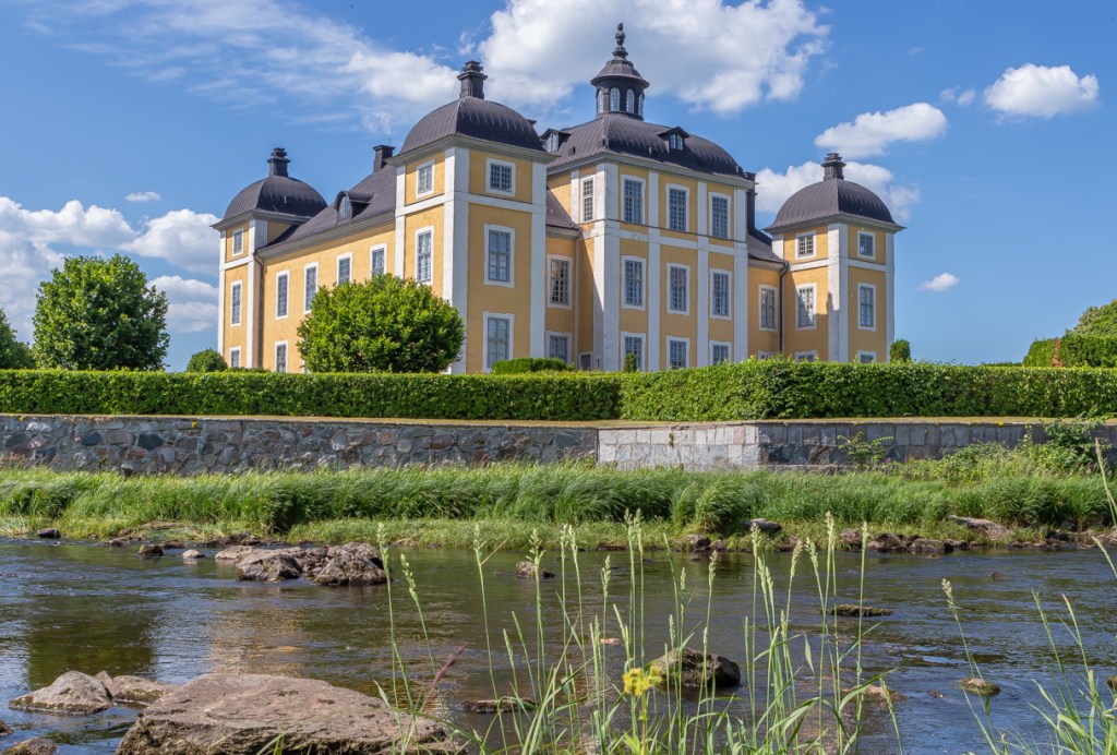 Södra och östra fasaden sedd från stranden i sydöst, med vallgraven/Kolbäcksån i förgrunden.