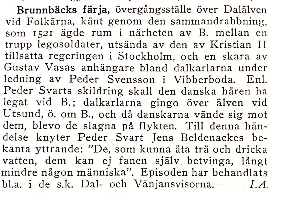 ”Brunnbäcks färja är ett gammalt färjställe vid Dalälfven, i en vacker nejd i Folkärna socken. Platsen, förr räknad som Dalarnas slutpunkt i s. och såsom gränsort lifligt trafikerad samt af en viss betydelse, är särskildt bekant för dalkarlarnas seger därstädes öfver Kristian II:s trupper april 1521. Regeringen i Stockholm hade låtit utrusta en, som det säges, till 6,000 man uppgående armé af holsteinare, danskar, skottar och fransmän för att kväfva upproret i Dalarna. En del däraf drog från Västerås upp till B. och lägrade sig där midt emot de på andra sidan älfven stående dalkarlarna. Jens Beldenak, som synes hafva varit en af expeditionens ledare, fick emellertid upplysning om, att dalkarlarna kunde uppställa ända till 20,000 man, hvilka i nödfall lefde på barkbröd och vatten. Förskräckt skall han då