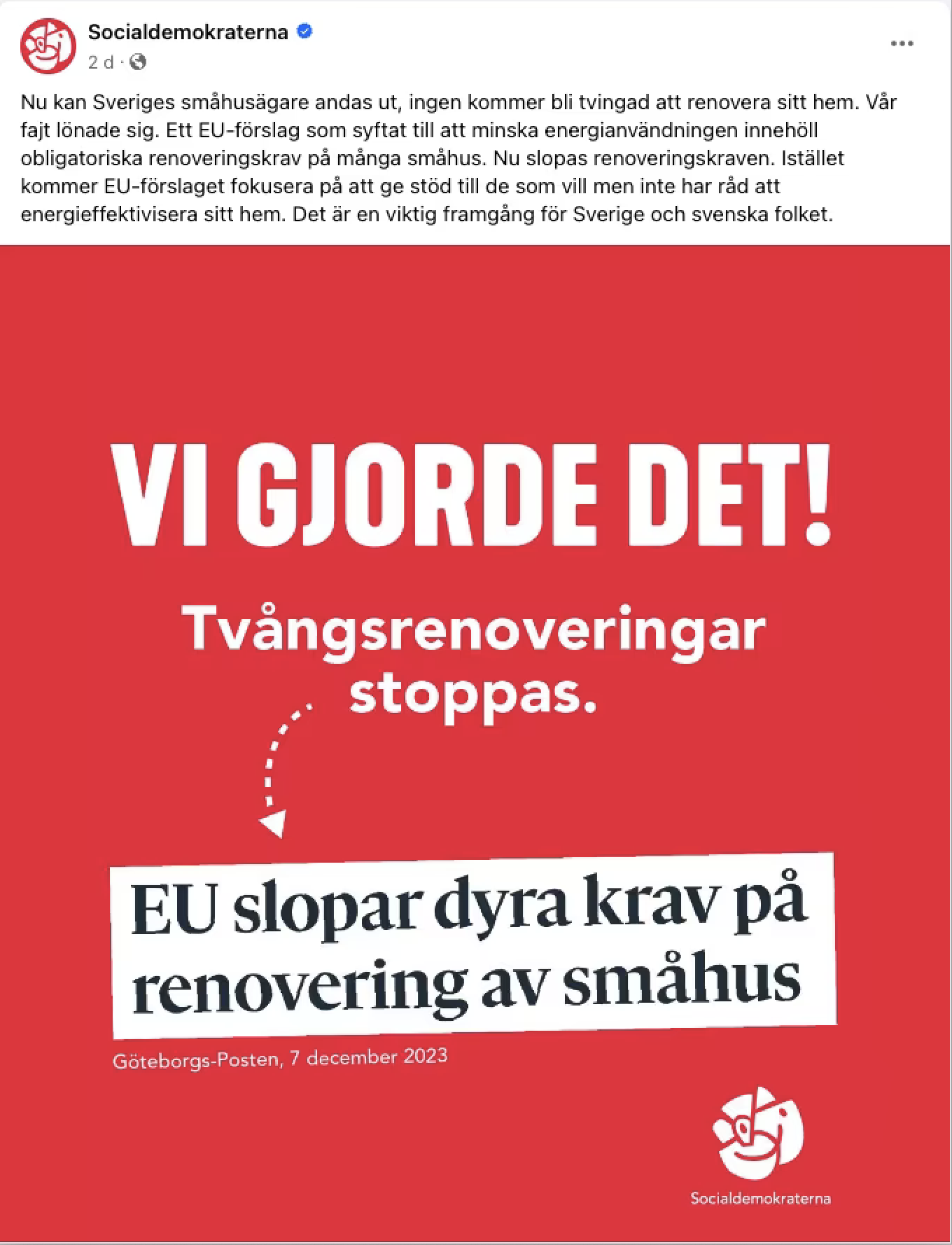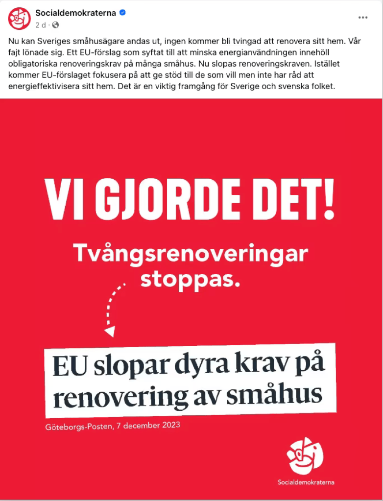 Svenska småhusägare slapp dock efter EU parlamentarikernas omröstning undan det hotande kravet på dyra energirenoveringar. EU:s energikrav drogs tillbaka efter förra veckans slutförhandlingar och omröstning.