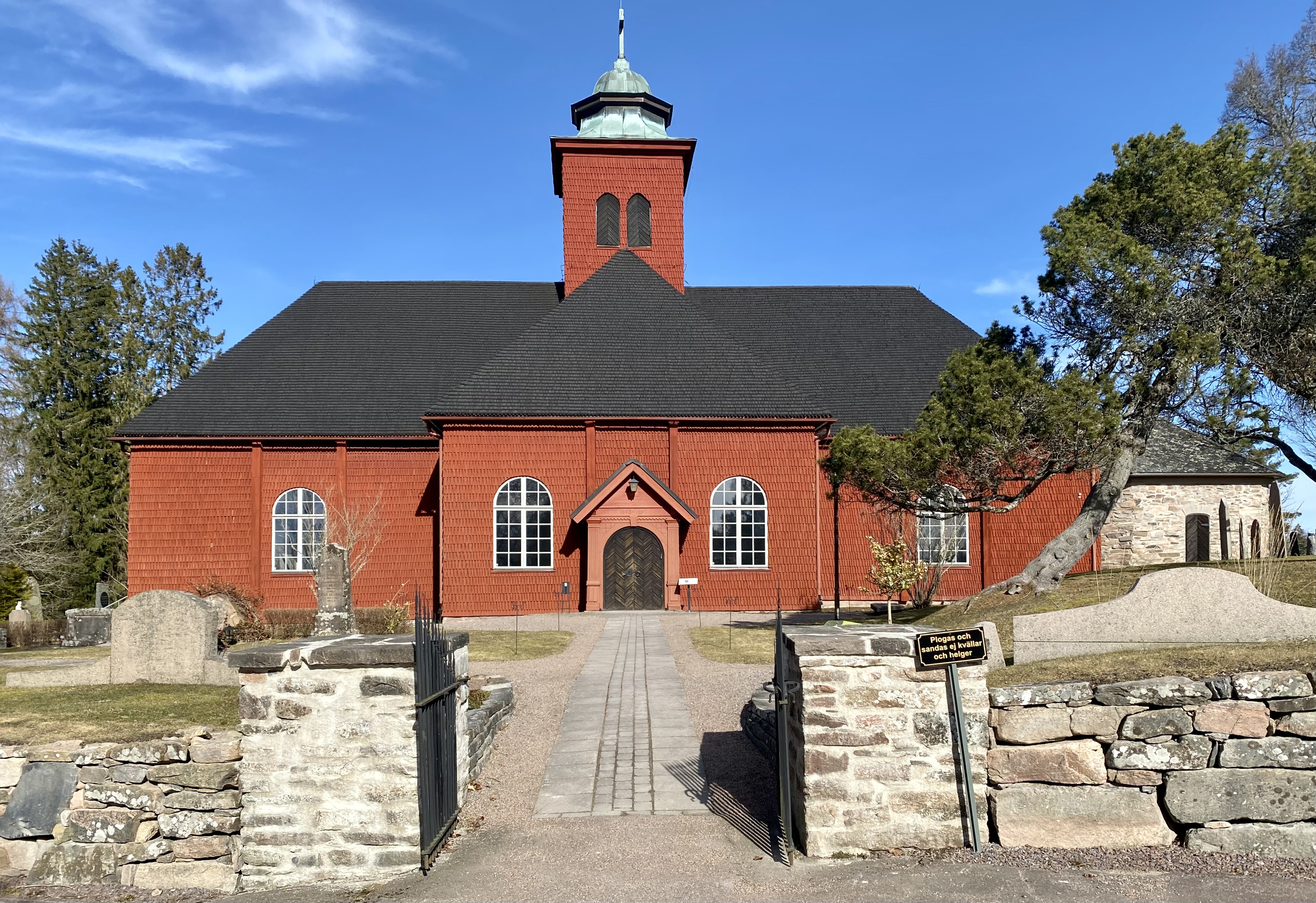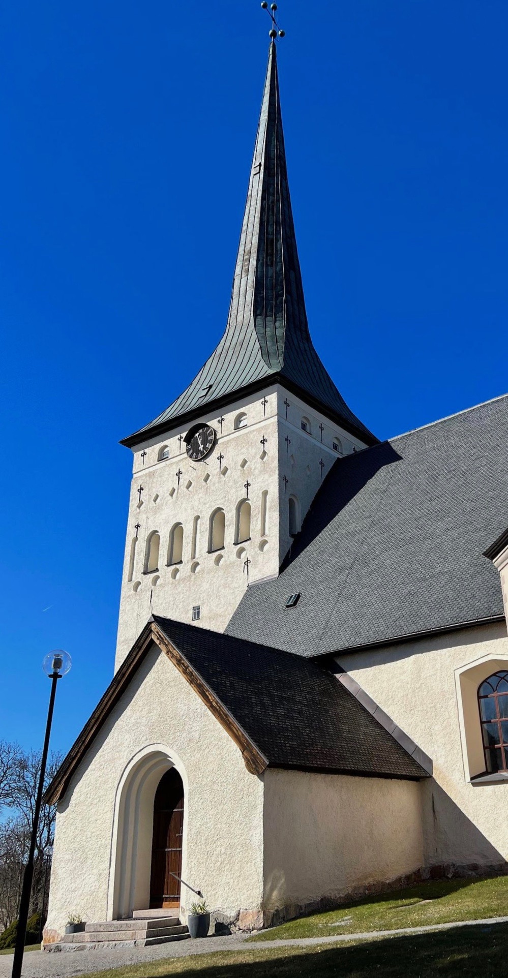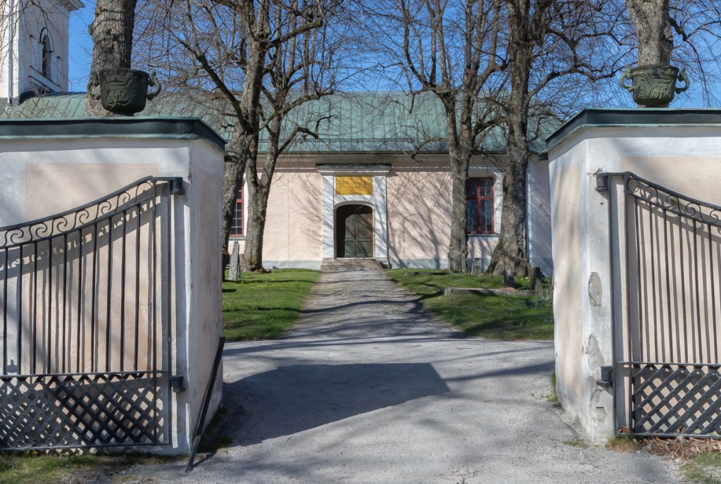 Entrén till kyrkan från söder med vapenhuset i förgrunden och ingången till kyrkan i bakgrunden