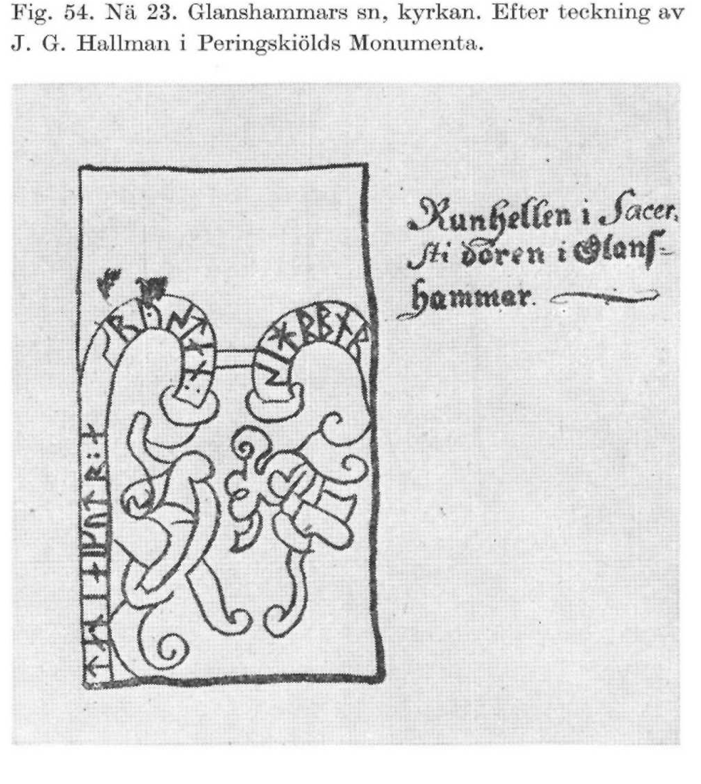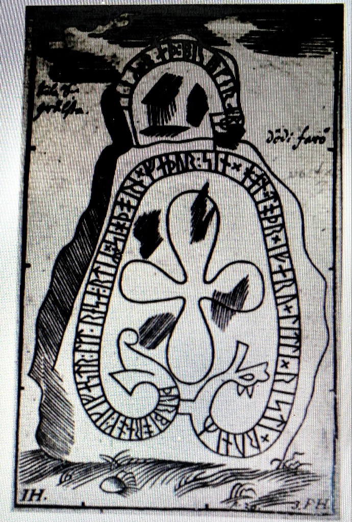 Runstenen fotograferad idag samt från en teckning av Johan Peringskiöld i hans Monumenta publicerad cirka 1700. Av jämförelsen mellan fotot och teckningen framgår att en övre del av runsten är bortslagen och förkommen. Runddjurets öppna käft har idag vassa tänder som inte finns med på teckningen och som sannolikt inte heller funnits ursprungligen. Teckningen av runstenen är noggrant utförd varför vi kan sluta oss till att tänderna inte är original. Kan de vara dithuggna senare av klåfingrig person? I så fall ett kulturhistoriskt nidingsdåd. Jag kontaktar länsstyrelsens avdelning för vård av historiska artefakter. Tänderna bör inte fortsättningsvis målas!