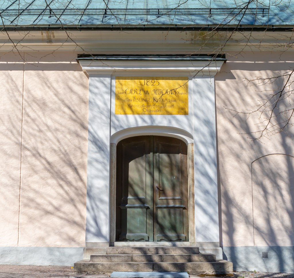 Åren 1822-23 förändrades Tysslinge kyrka radikalt till en s.k. karl Johan kyrka, vilket framgår av överskriften till den södra kyrkporten.