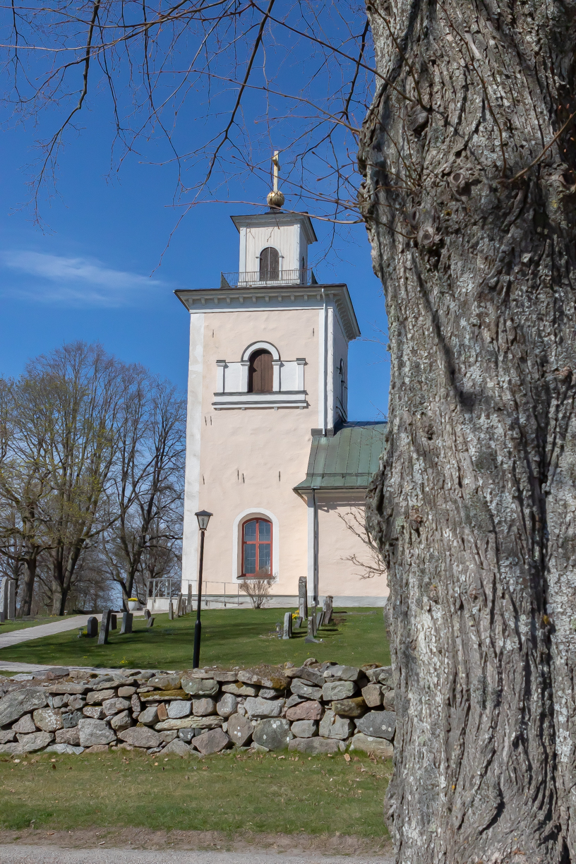 Tysslinge kaKyrkan fotograferad från Åkerbymaden, östra sidan av sjön Tysslingen.
