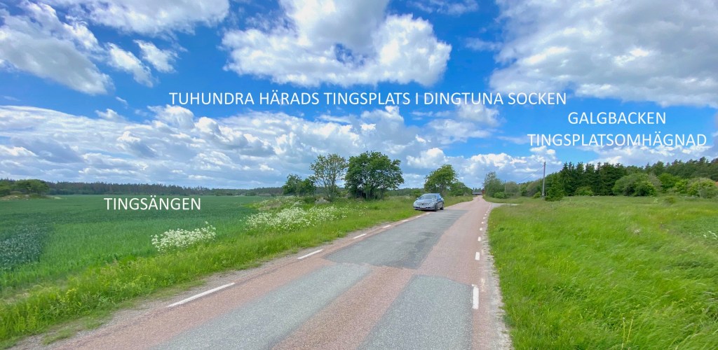 En vacker försommardag gjorde Britt och jag en historisk exkursion till några äldre västmanländska fornminnen och en kyrka. Vi sökte främst den plats där tinget för Tuhundra hundare (senare härad) hållits under århundraden fram till mitten 1500-talet då Tuhundra hundares ting flyttade inomhus till Dingtuna klockarestuga. Beskrivningar i äldre texter vägledde oss till den plats som bör vara den rätta och som också är i överensstämmelse med traditionen på orten, belägen mellan Östjädra och Västjädra någon kilometer NV om Dingtuna kyrka.