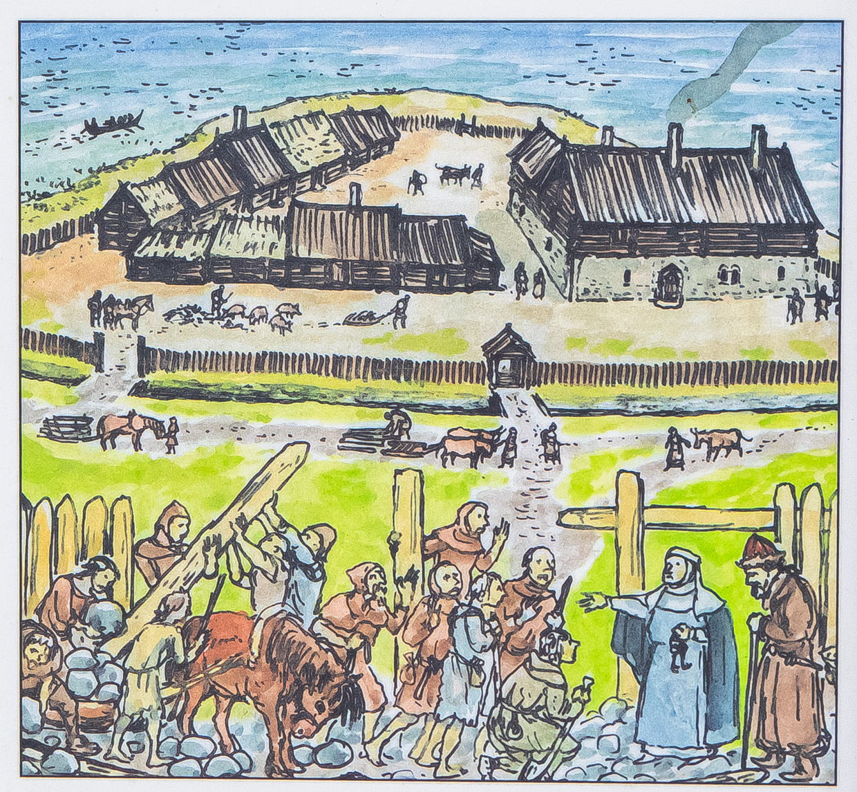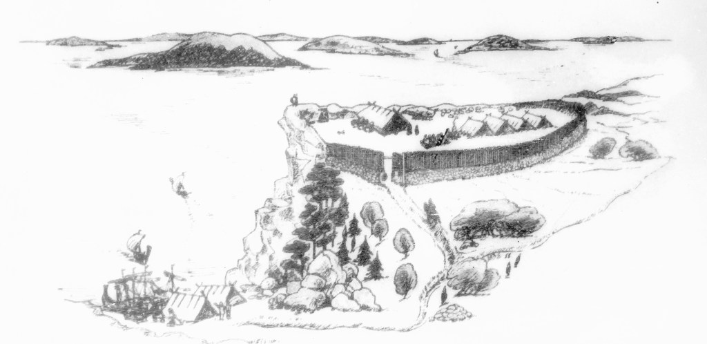 En rekonstruktion av hur en fornborg kan ha sett ut som hade försvarsfunktioner vid en farled.