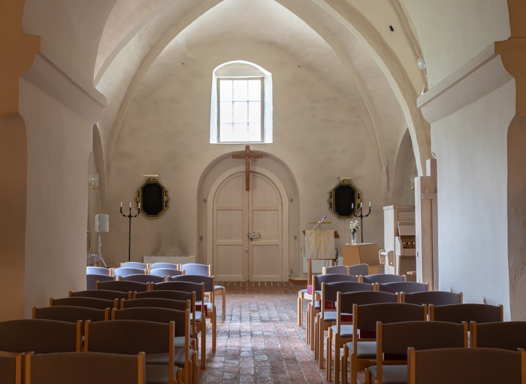Kyrkans huvudskepp sedd från väster och entrén mot öster och koret.