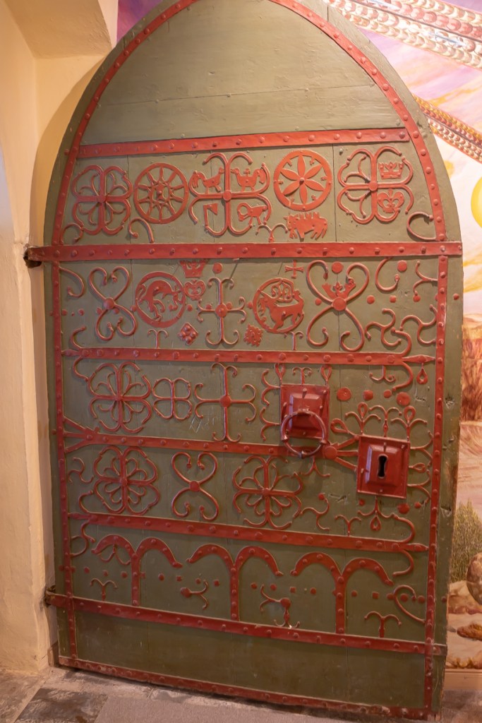 En medeltida järnbeslagen korport på kyrkans sydsida. Korporten bär ett krucifix (högt upp på porten halvt i skugga) och vapensköldar. Ett av dem har identifierats som biskop Otto Svinhufvuds från början av 1500-talet. Även vapenhusets port är beslagen med järnsmide från medeltiden.