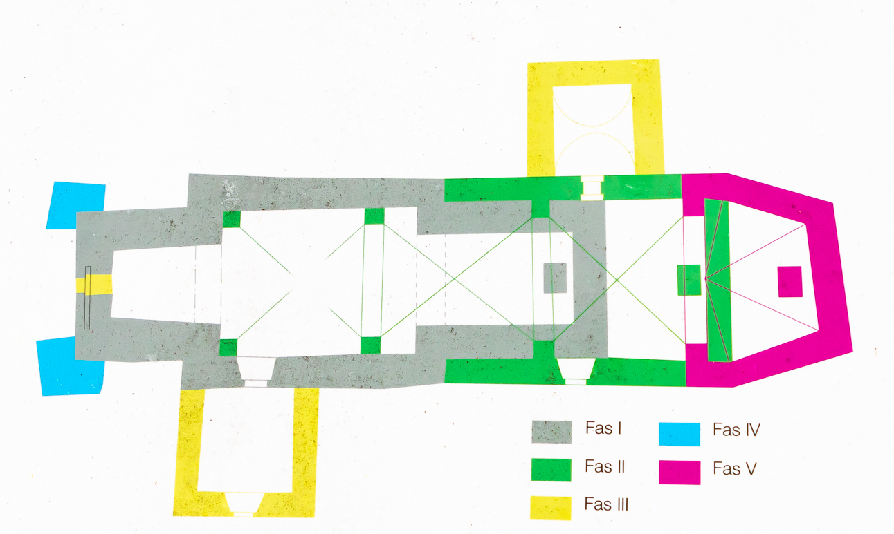 Ritningen nedan visar hur Stora Rytterne kyrka byggdes till under loppet av 500 år.