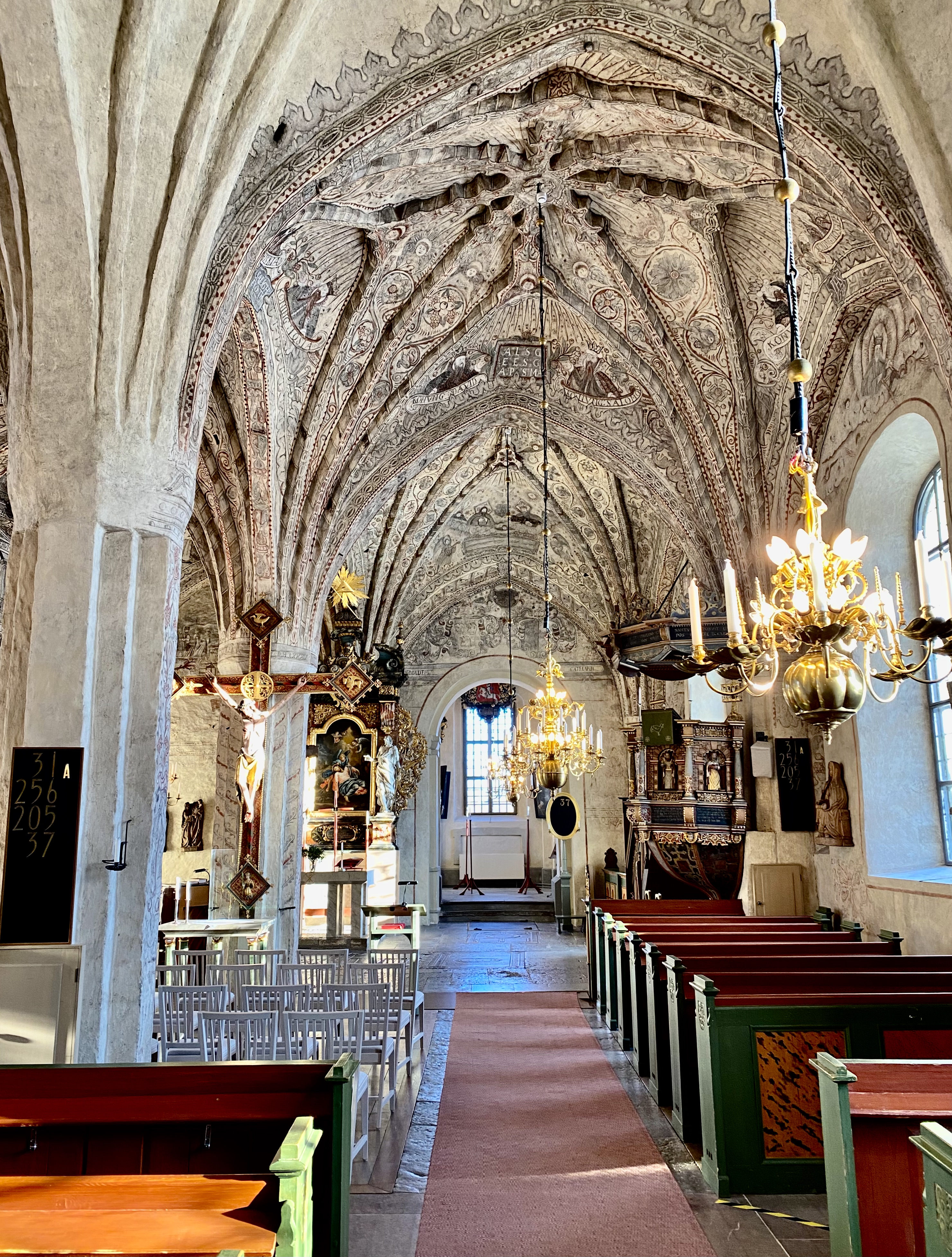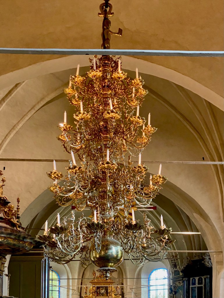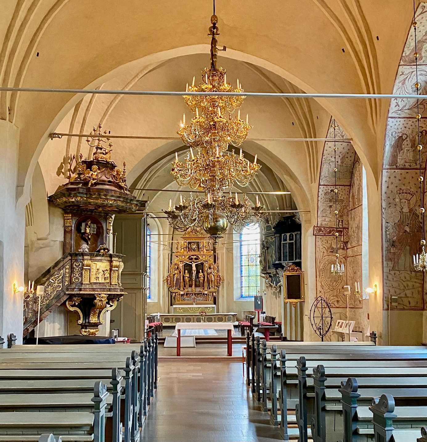 Ljuskronorna i mässing med fyrtio ljuskronor vardera, är Sveriges, kanske Nordens, största. De är gåvor till kyrkan från privatpersoner och sannolikt tillverkade i norra Tyskland.