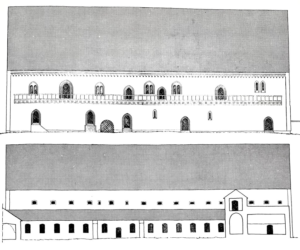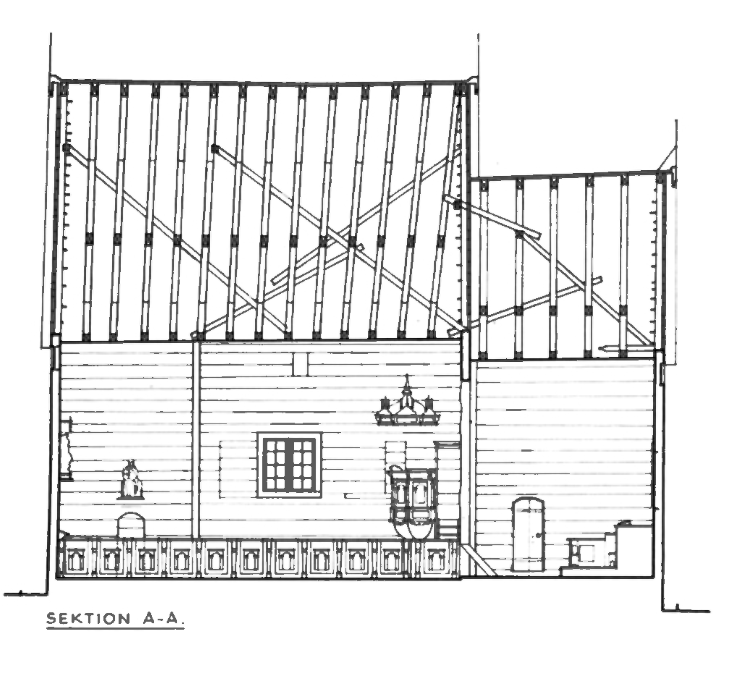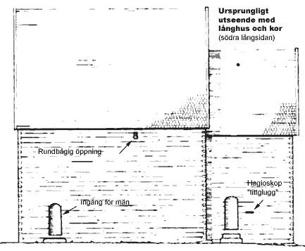 Övre skissen kyrkan uppmätt 1970 av innerväggen mot norr och den undre ytterväggen sedd från söder. J Söderberg