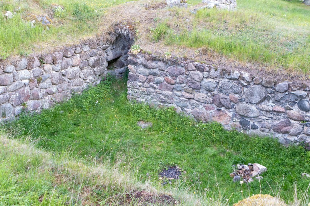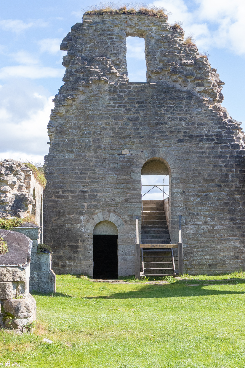 Resterna av västtornet sedd från väster med fundamenten till strävpelarna på var sida om ingången.