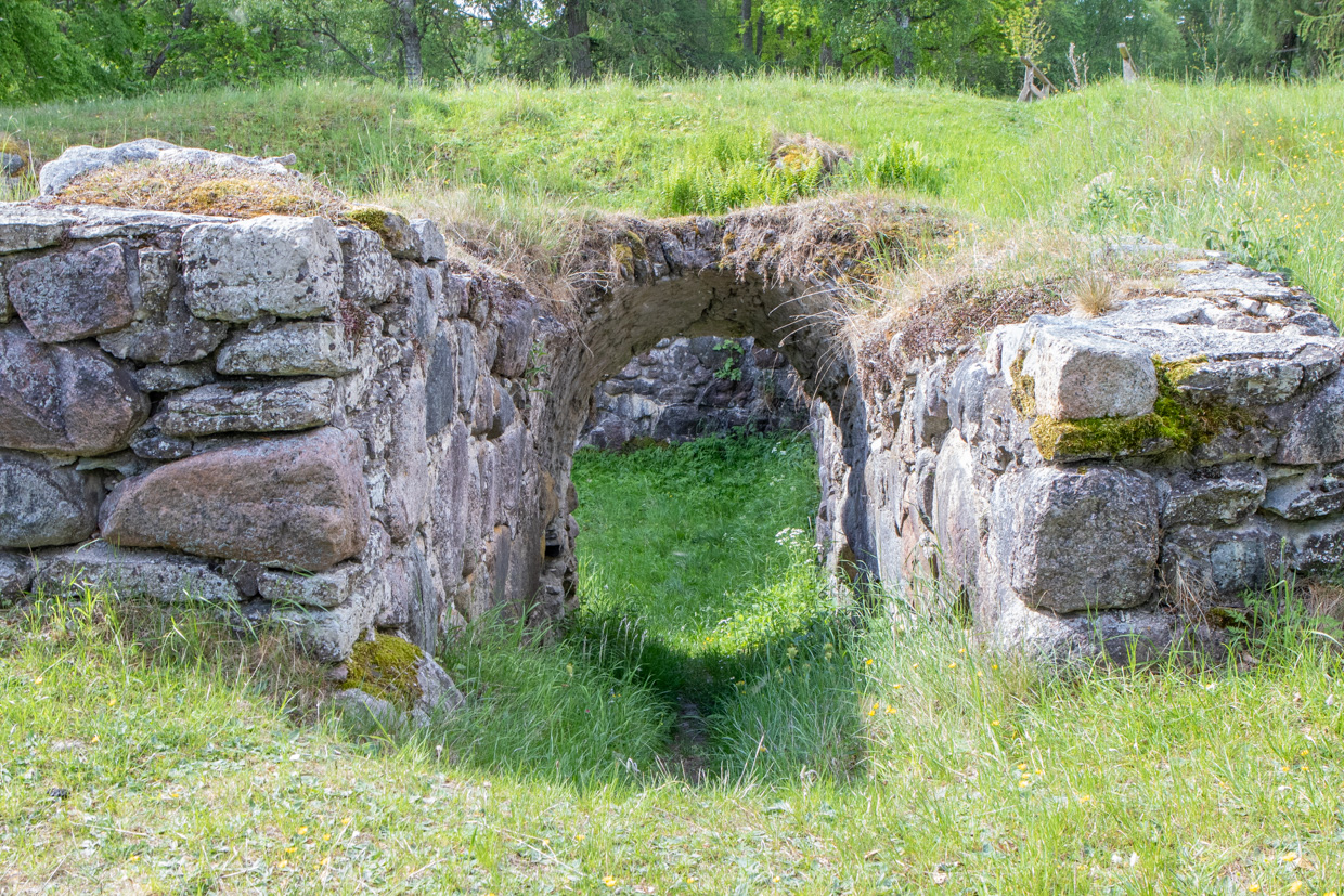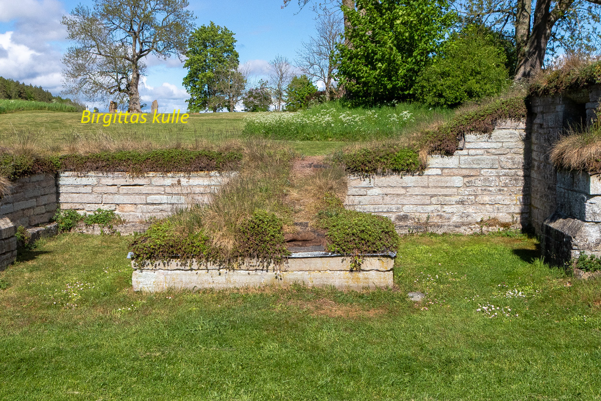 Kyrkoruinen sedd från söder med 1600-tals gravhällar i förgrunden till vänster. Tegelvalvet i bakgrunden är ingången till sakristian med korets yttervägg till höger.