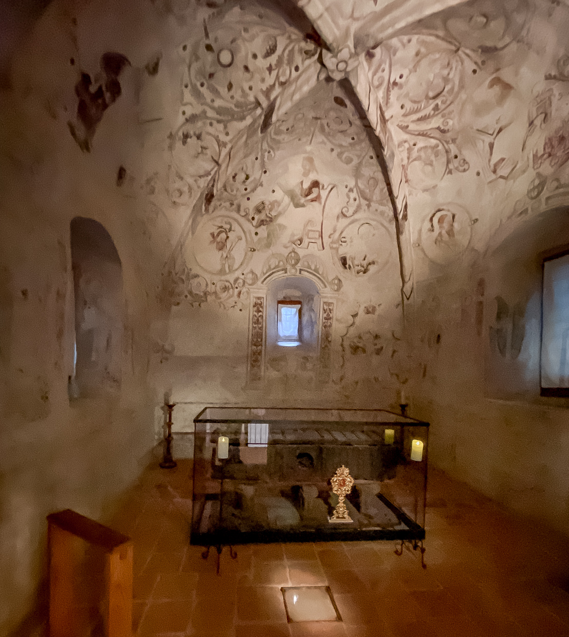 I korets södra del nära portalen och ca 1 m över golvet finns en urtagning i väggen. Genom springan i ytterväggen kan man se in i koret mot altaret. Luckan har varit avsedd som ett s k hagioskop, dvs en öppning genom vilken den som var utestängd från den katolska kyrkan av något skäl (smittsam sjukdom eller av annat skäl) kunde följa mässan och eukaristin utifrån och eventuellt be egna böner med altaret i synfältet.