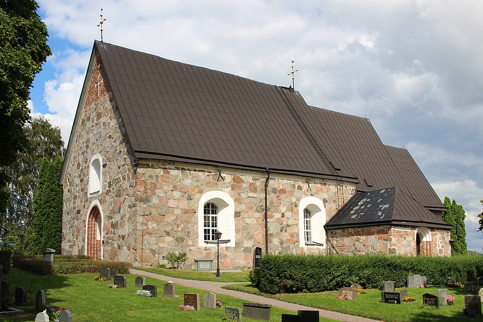 Vid början av 1200-talet ersattes den första träkyrkan av en stenkyrka. Den byggdes från början med ett västtorn vilket är ovanligt. Förekomsten av ett torn redan från kyrkans begynnelse tolkas som att ägarna till några av de stora godsen i socknen tog initiativ till bygget.