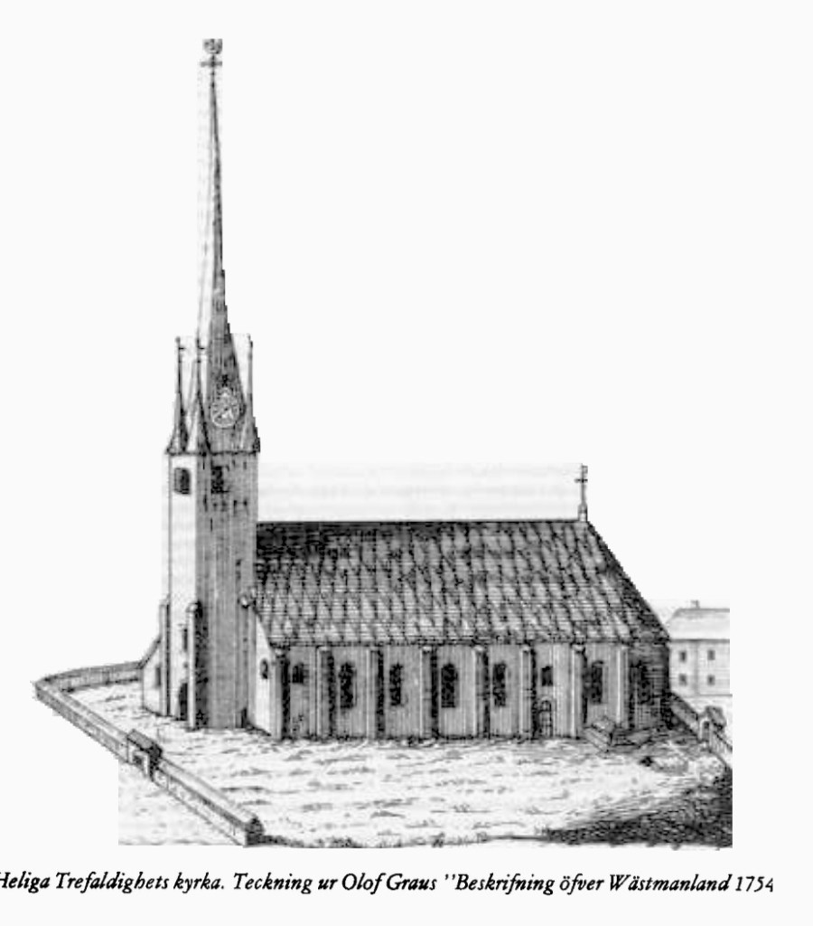Dingtuna kyrka tecknad av Olof Grau i början av 1750-talet och presenterad i hans viktiga arbete ”Beskrifning öfver Wästmanland” från 1754.