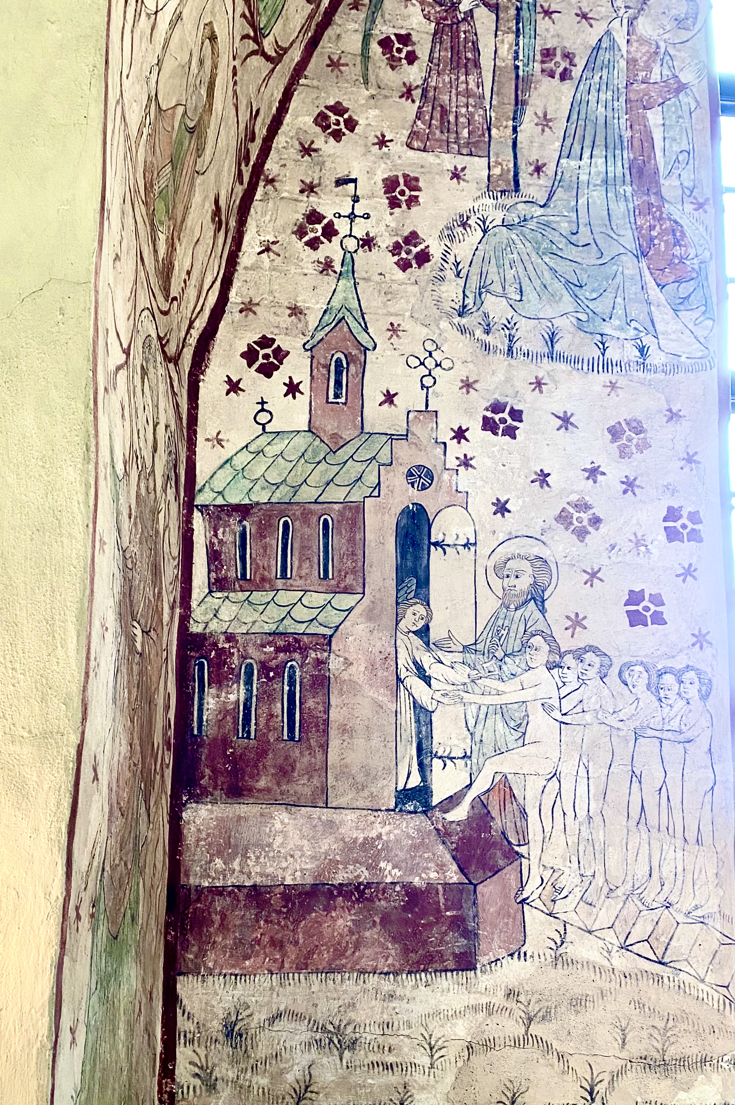 Kyrkomålaren på 1400-talet kan ha haft Heliga Trefaldighetskyrkan som förebild. Den senmedeltida kyrkan hade inget västtorn (det byggdes senare) utan en takryttare vilken är införd på denna väggmålning.