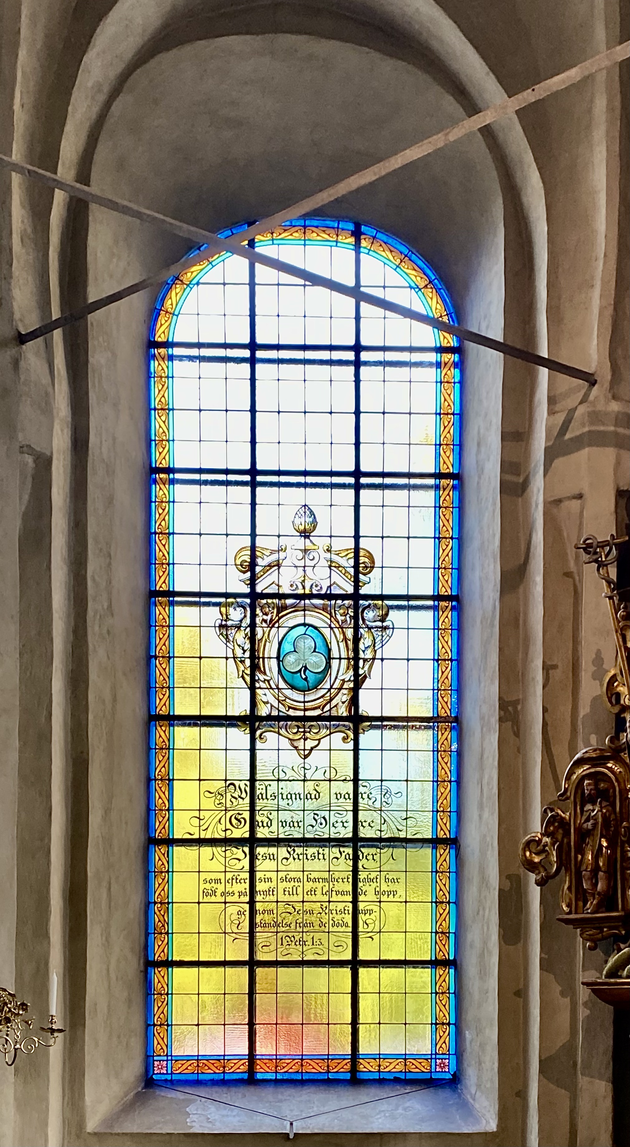 Ett av de vackert målade korfönstrens som härrör från 1800-talet. Detta fönster på nordsidan av koret.