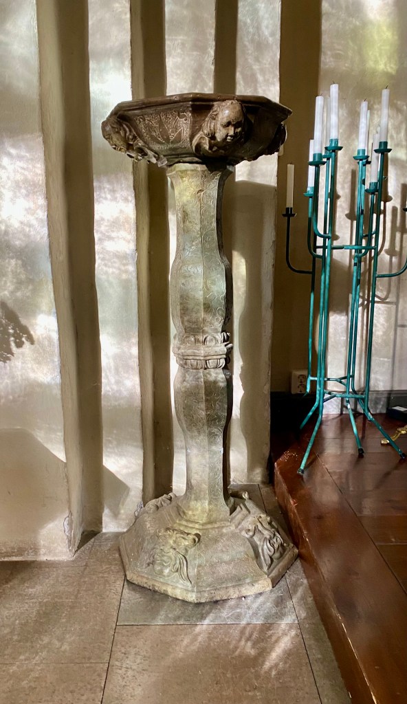 Dopfunten är från 1400-talet och tillverkad i Mälardalen. Senmedeltida stil med kraftig knutformad nod, cuppan ornamenterad med genometriskt mönster och foten med bladranka.