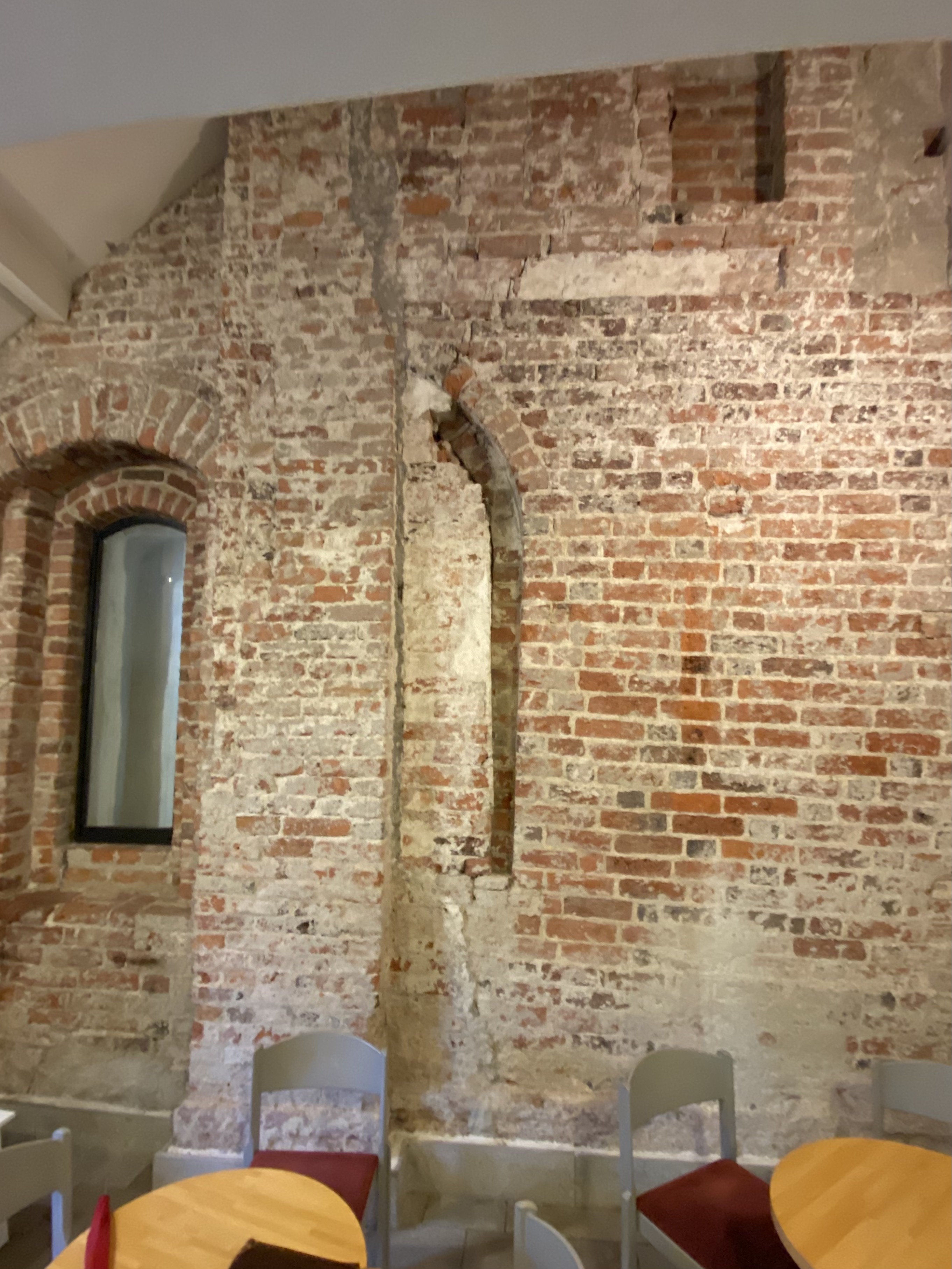 Blinderingar och fönster i kyrkans ursprungliga västvägg. Numera och sedan 1600-talet dolda av västtornet.
