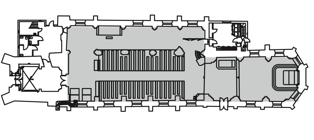 Planritningen ovan visar kyrkans layout idag.Kyrkans grundplan är fortfarande de medeltida.