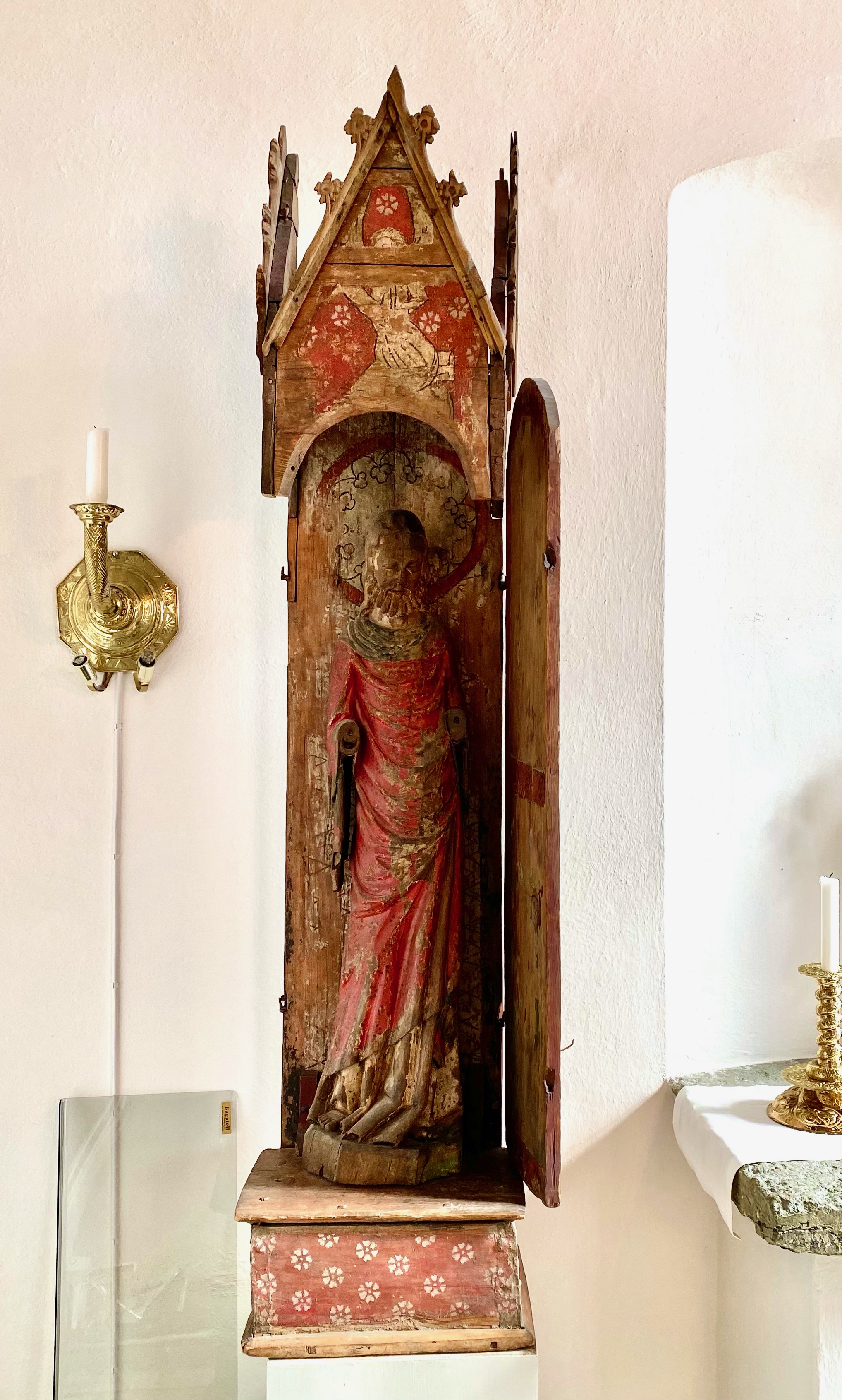 Den gamla romanska sydporten är igenmurad men den romanska portalen med tympanon med tyvärr otydbara figurer finns kvar.