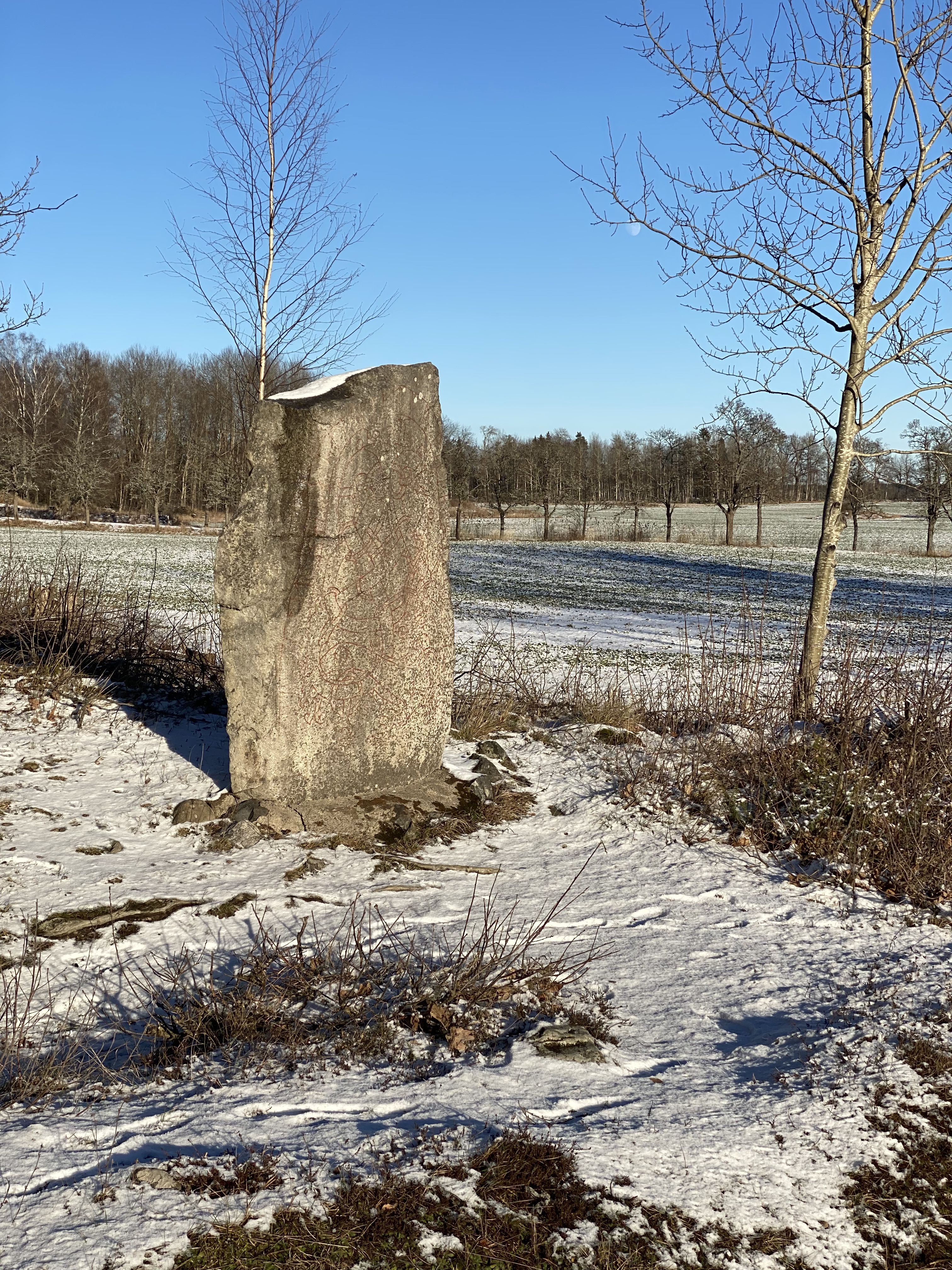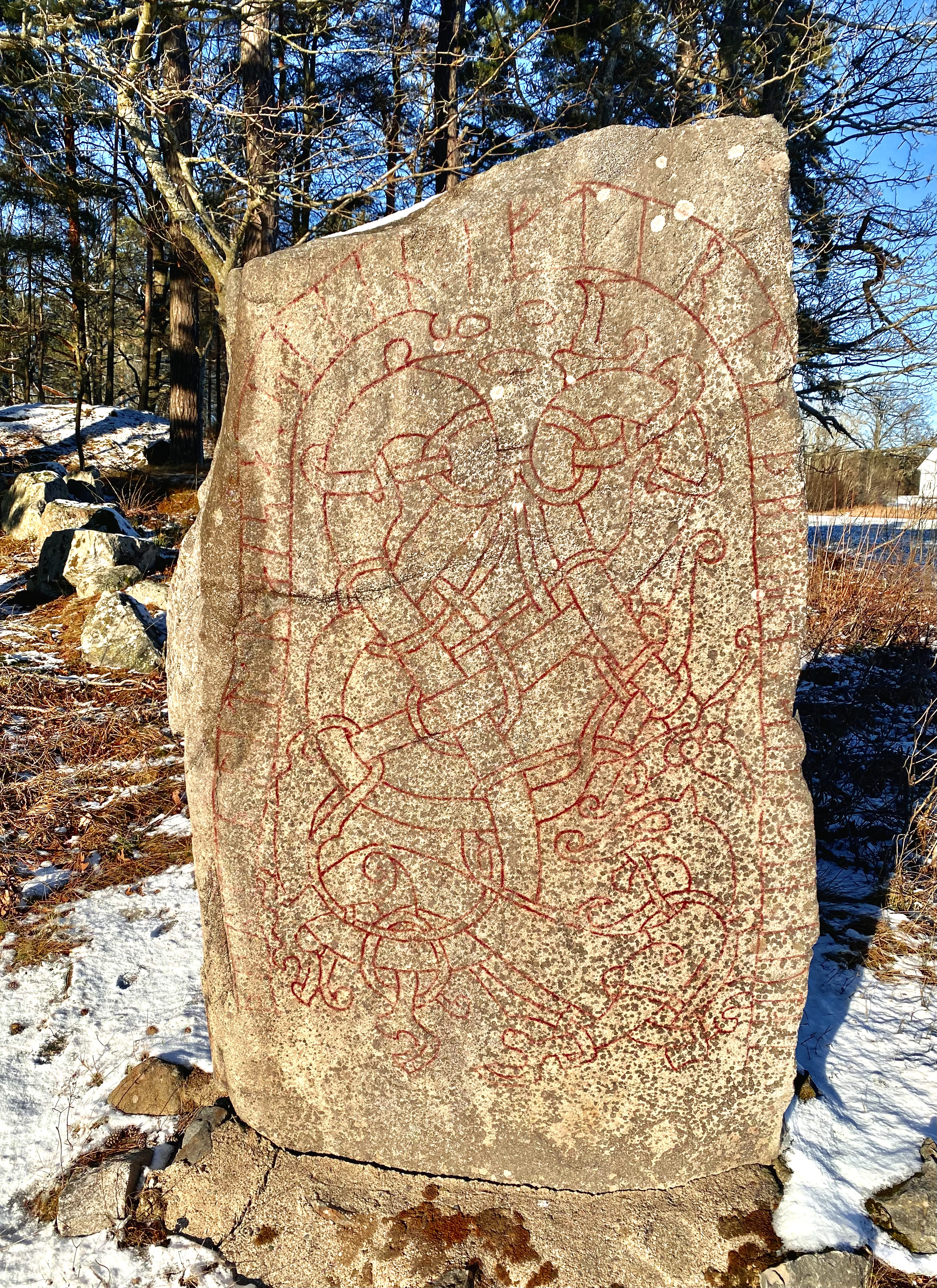 Min bild ovan är tagen den 4 januari 2023 och trots försök att färgförstärka den rödfärgade runraden så är den inte läslig. I min värld är det en skandal att Sveriges och det svenska folkets historia hanteras så illa av ansvariga myndigheter. Skattemedel borde finnas för att sköta våra tusenåriga minnen som visar det första svenska skriftspråket och med personliga meddelanden som bär fram till idag från vikingatiden.