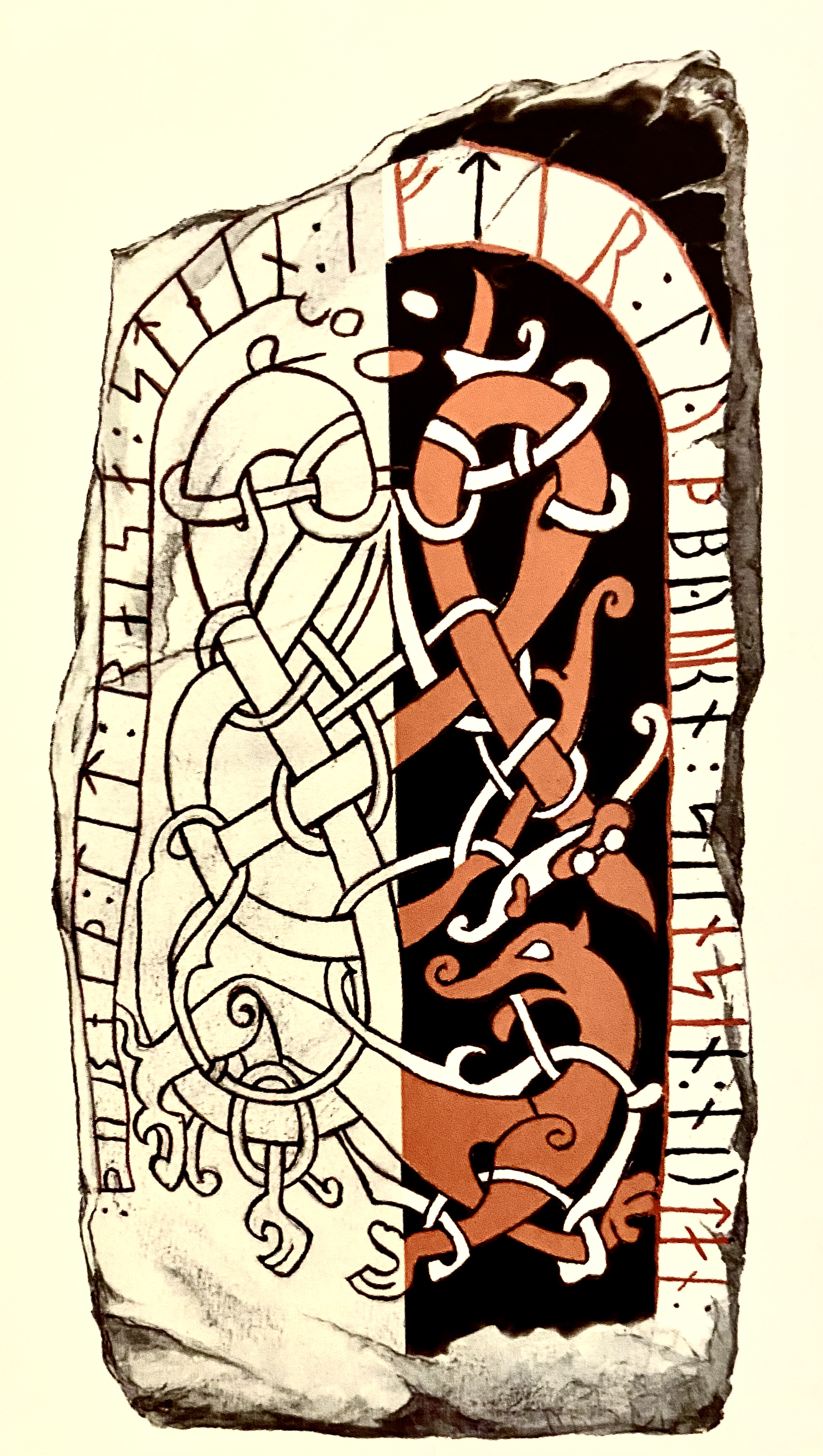 För att läsaren skall få en bild av hur runstenen kan ha sett ut en gång har halva runsten på nedanstående bild rekonstruerats med de färger den kan ha haft. Anslående, eller hur?